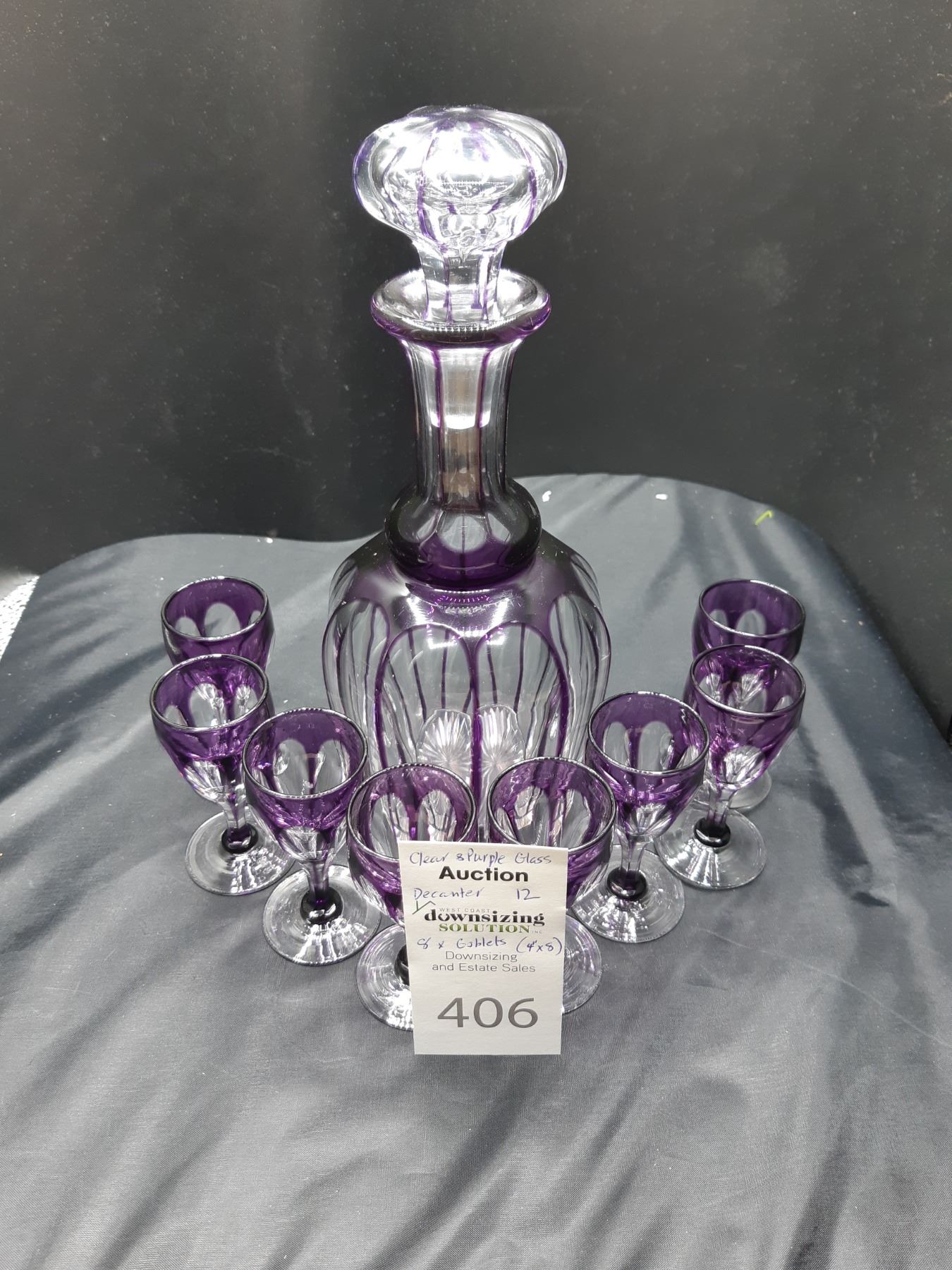 12" Decanter of Clear & Purple Glass with 8 x 4" goblets. Bring packing material and pickup at 10 am