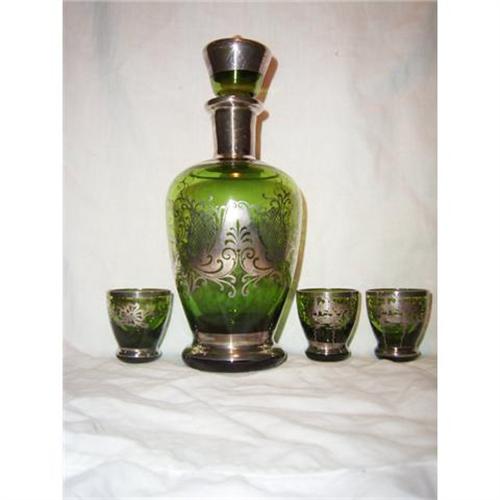 Hand blown Venetian crystal decanter, decorated with sterling silver with 3 glasses.