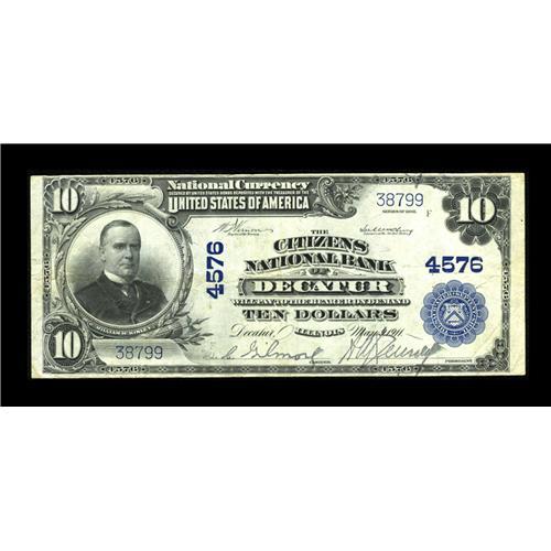<B>Decatur, IL</B></I> - $10 1902 Plain Back Fr. 627 <B>The Citizens NB</B></I> Ch. # 4576<BR>A nicely margined, bright and crispy $10 Plain Back from De Witt County. The stamped signatures are still quite strong and there are no distractions to impair the overall attractive eye appeal of this premium circulated example. <B>Very Fine.</B></I><BR><BR><b>Shipping:</b> Coin/Currency (<a target="_blank" href="http://www.heritageauctions.com/common/shipping.php">view shipping information</a>)