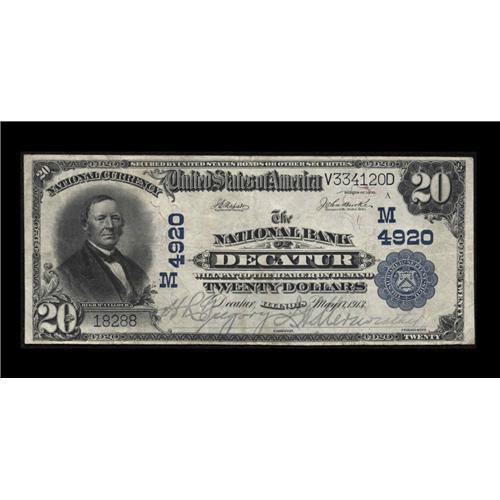 <B>Decatur, IL</B></I> - $20 1902 Plain Back Fr. 656 <B>The NB</B></I> Ch. # (M)4920<BR>Nice stamped signatures adorn this De Witt county $20. <B>Very Fine.</B></I>