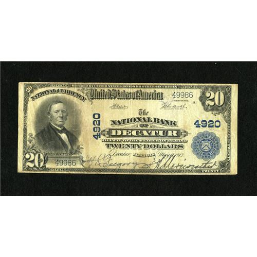 <B>Decatur, IL</B></I> - $20 1902 Plain Back Fr. 656 <B>The NB of Decatur</B></I> Ch. # 4920<BR>The stamped signatures remain bold. There is some toning of the paper noted. <B>Very Good-Fine.</B></I><BR><I>From The Lincoln Collection</B></I><BR><BR><b>Shipping:</b> Coins & Currency (<a target="_blank" href="http://www.heritageauctions.com/common/shipping.php">view shipping information</a>)