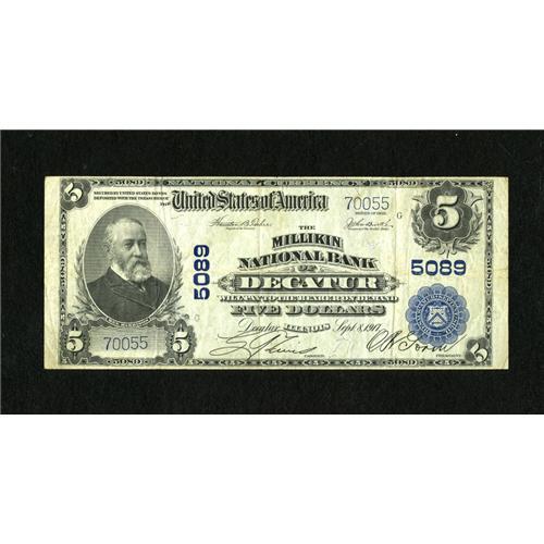<B>Decatur, IL</B></I> - $5 1902 Plain Back Fr. 606 <B>The Millikin NB</B></I> Ch. # 5089<BR>Similar to the issue from Citizens Bank of Decatur, this piece is most pleasing in quality and originality. The engraved signatures complement the eye appeal of the note. <B>Very Fine.</B></I><BR><I>From The Lincoln Collection</B></I><BR><BR><b>Shipping:</b> Coins & Currency (<a target="_blank" href="http://www.heritageauctions.com/common/shipping.php">view shipping information</a>)