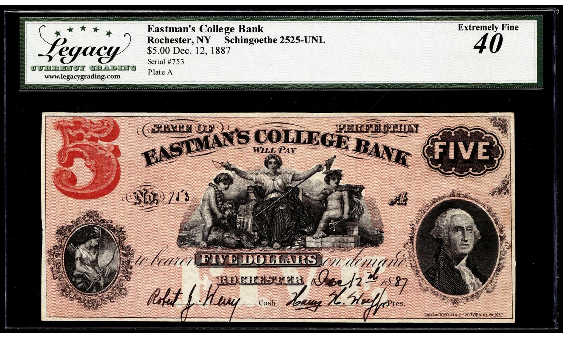 One December 12, 1887 $5 Eastman College Bank Rochester, NY Note Legacy Extremely Fine 40. Legacy Graded.