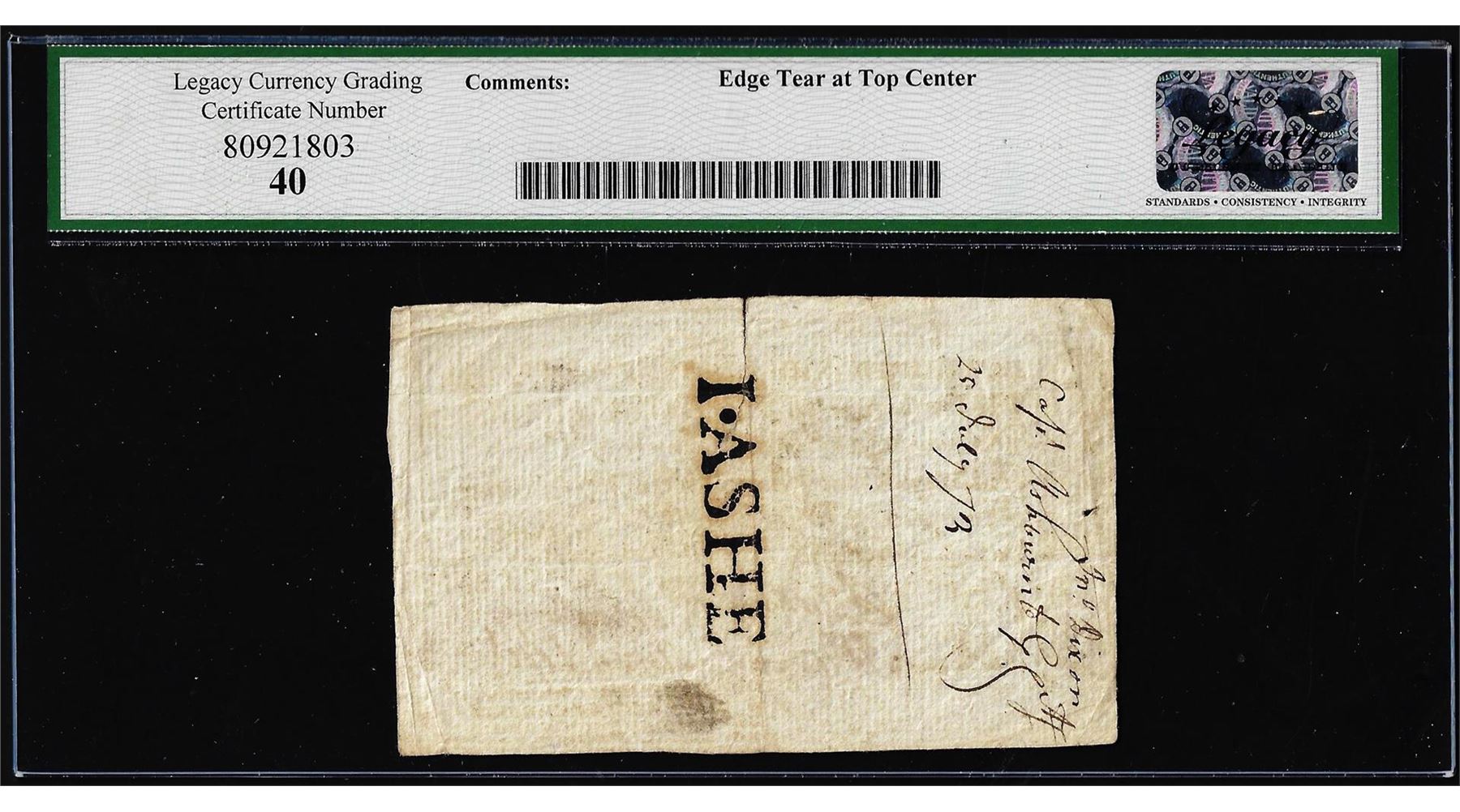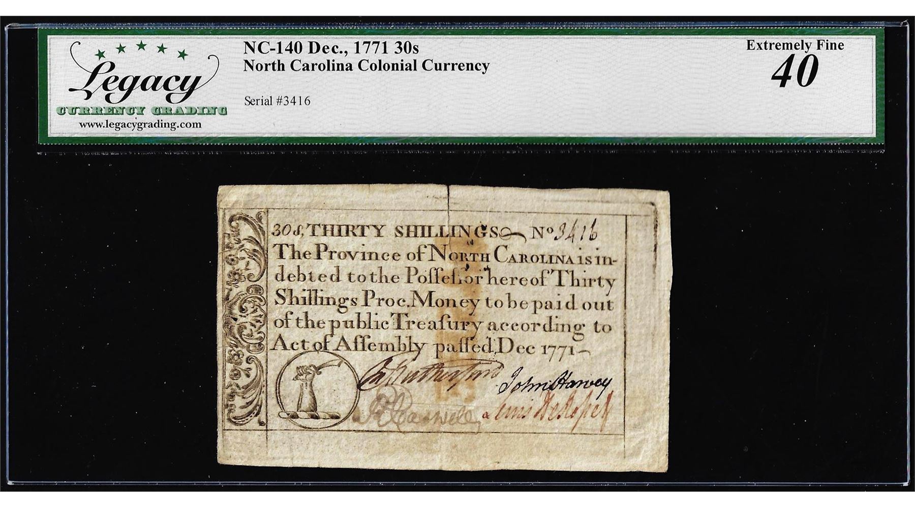 One December 1771 30 Shillings North Carolina Colonial Note NC-140 Legacy Extremely Fine 40. Legacy Graded.