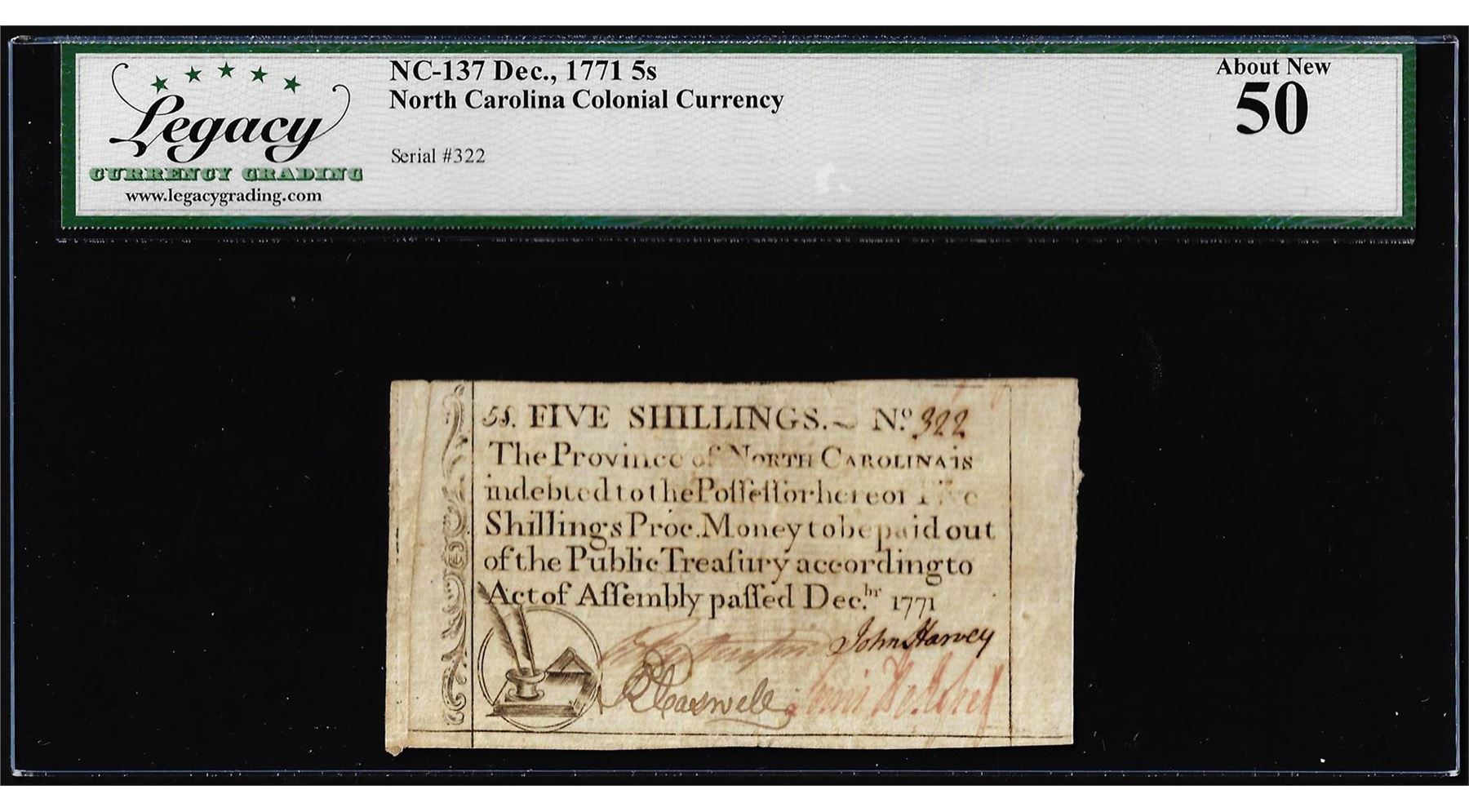 December 1771 5 Shillings North Carolina Colonial Note NC-137 Legacy About New 50