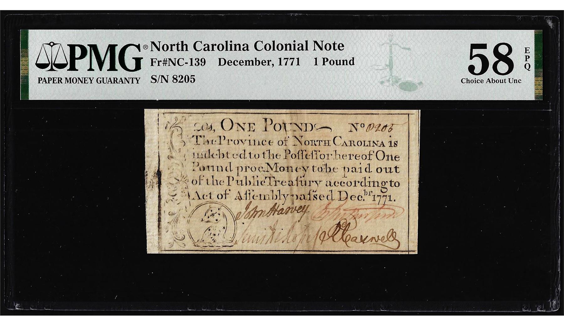 One December 1771 North Carolina 1 Pound Colonial Note PMG Choice About Unc. 58EPQ. PMG Certified.