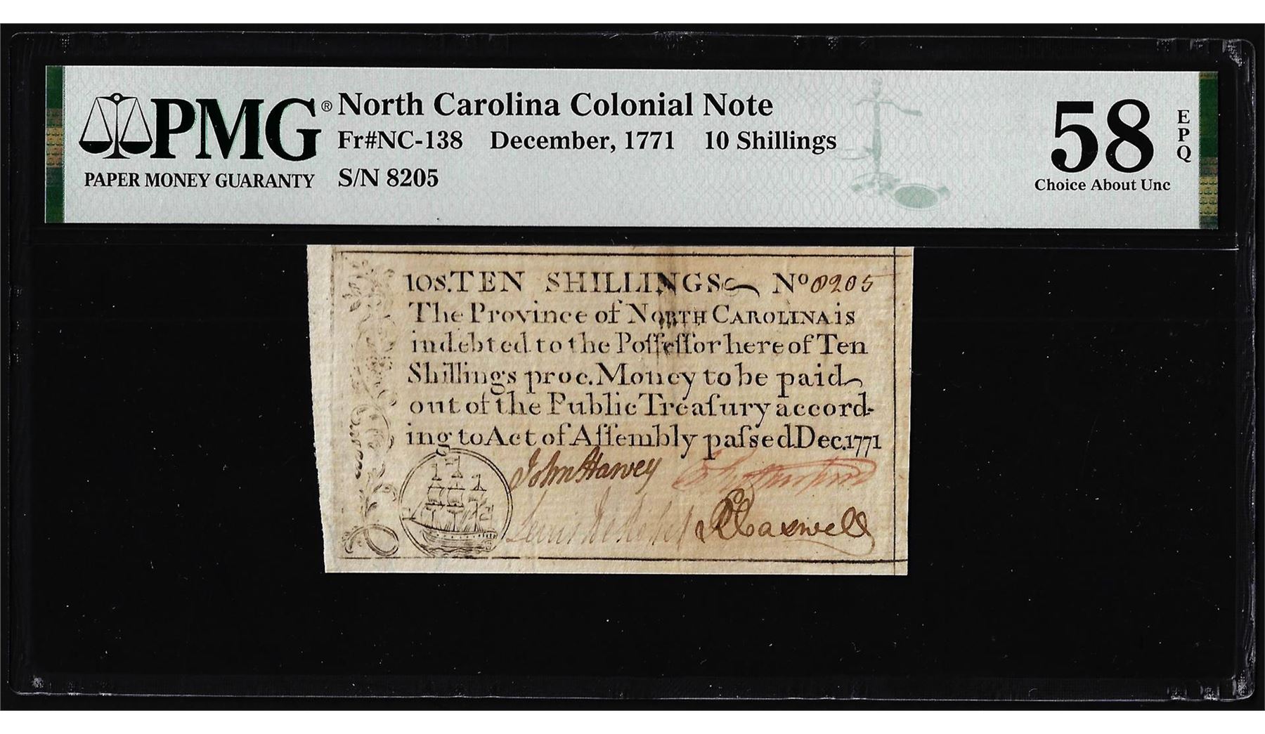 One December 1771 North Carolina 10 Shillings Colonial Note PMG Choice About Unc. 58EPQ. PMG Certified.