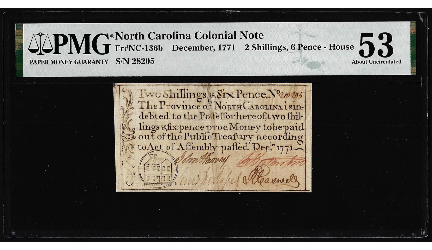 One December 1771 North Carolina Two Shillings Colonial Note PMG About Uncirculated 53. PMG Certified.