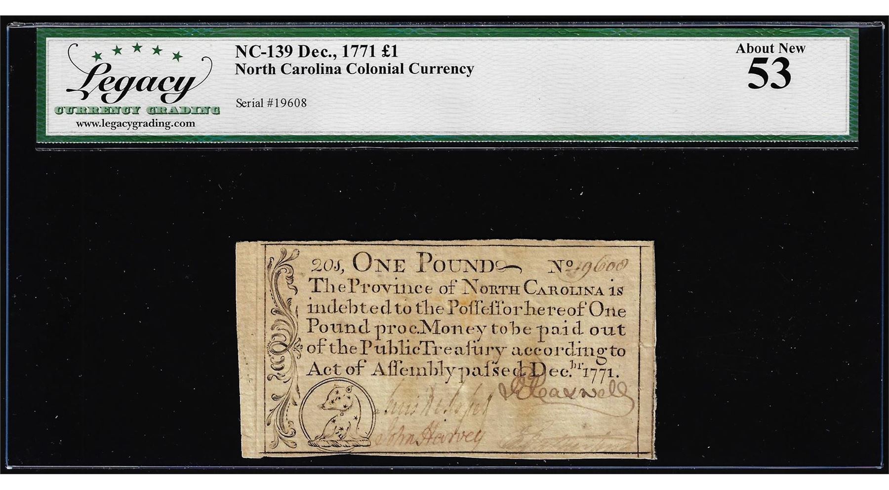 One December 1771 One Pound North Carolina Colonial Note NC-139 Legacy About New 53. Legacy Graded.