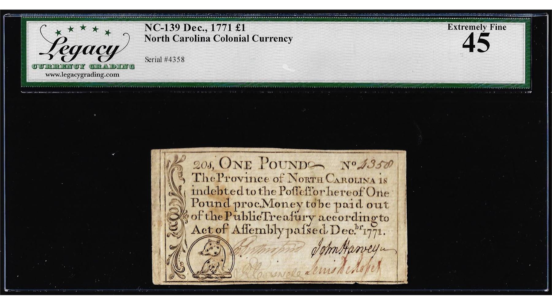 One December 1771 One Pound North Carolina Colonial Note NC-139 Legacy Extremely Fine 45. Legacy Graded.
