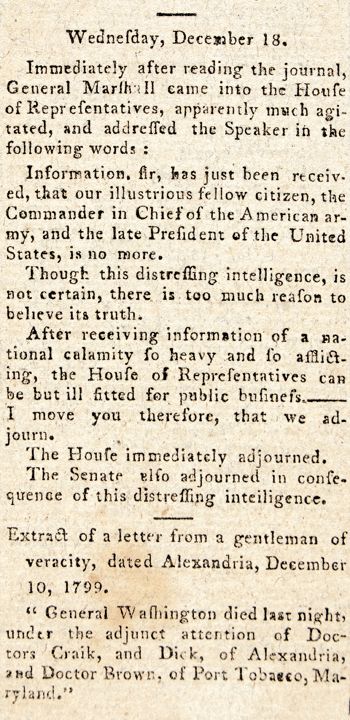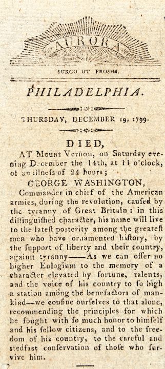 December 19, 1799-Dated, Newspaper titled, “The Aurora General Advertiser,” Report of the Death of General Washington, Philadelphia, Choice Very Fine.