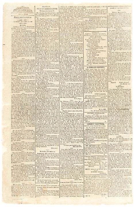 The Death of General and President George Washington occurred just Five Days before this early Newspaper report. He died on December 14, 1799. It measures 19.75” x 12.75” with 4 pages, on page two, the noteworthy news item of the Death of General Washington is located. George Washington's death takes up but a single paragraph, being such an early report and then being fit in at the very last minute. The paper has been conserved, so to stay open to this historic report on page 2. This same page has commercial advertisements, reward notices, foreign news, and a call for a meeting of Republicans to discuss the upcoming Presidential election. There are deft archival repairs including to a 3” vertical tear and 1.5” horizontal tear through all 4 pages, about 10” from top along right edge. It is very clean and pleasing in appearance for display, fundamentally whole and complete with distinct, sharply printed text. An important, very early notice on the death of George Washington.