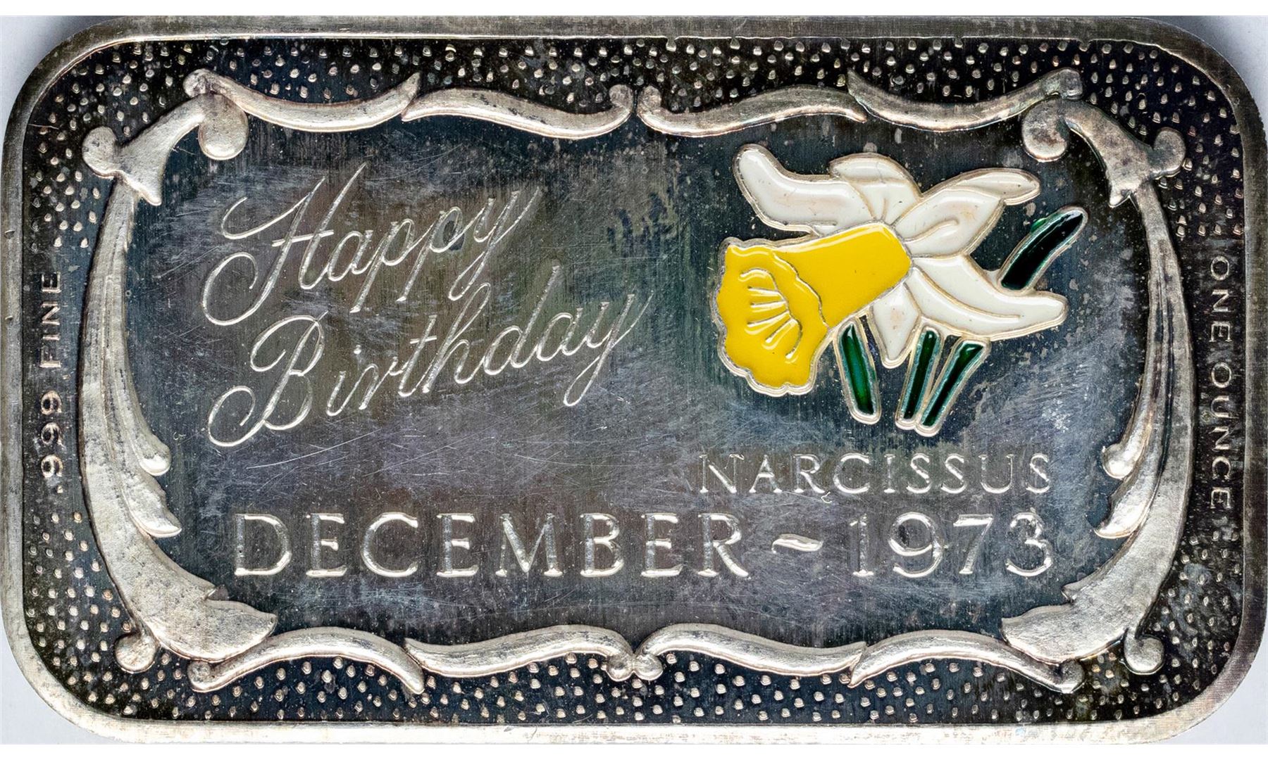 One December 1973 Happy Birthday Enamel Silver Art Bar.