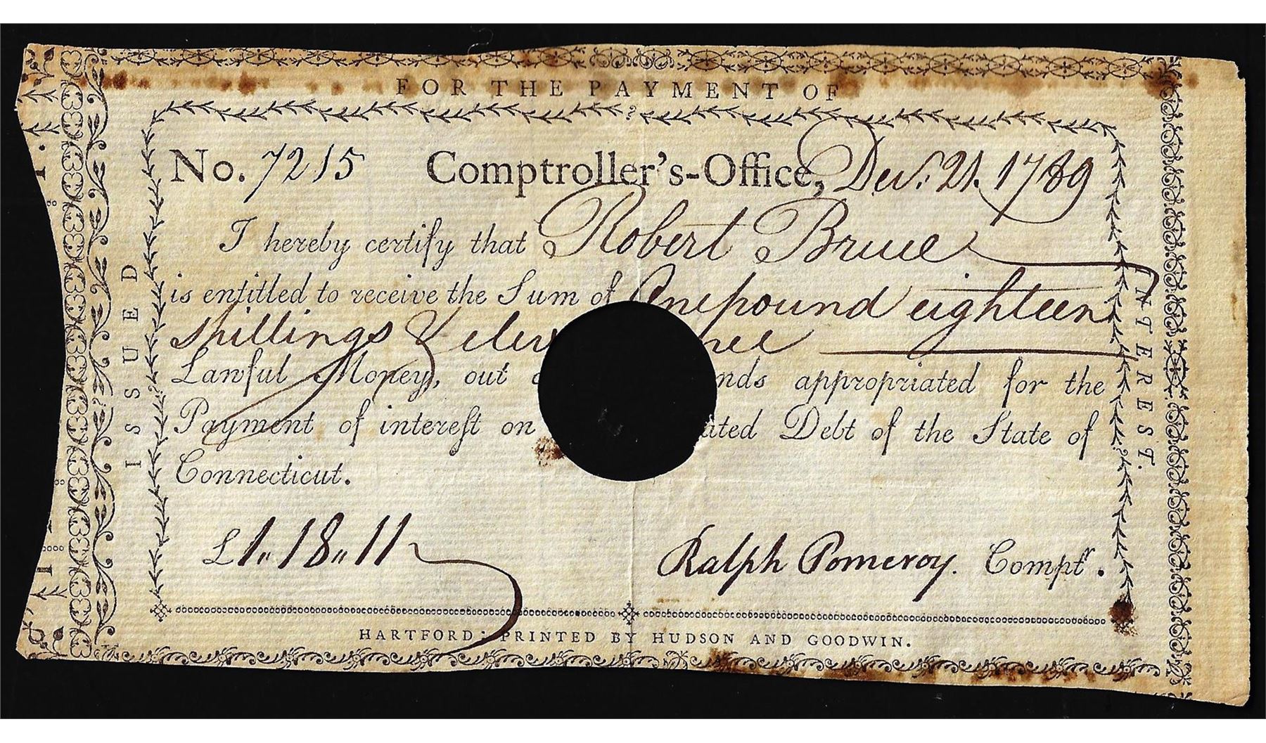 December 21, 1789 State of Connecticut Interest Certificate Colonial Note