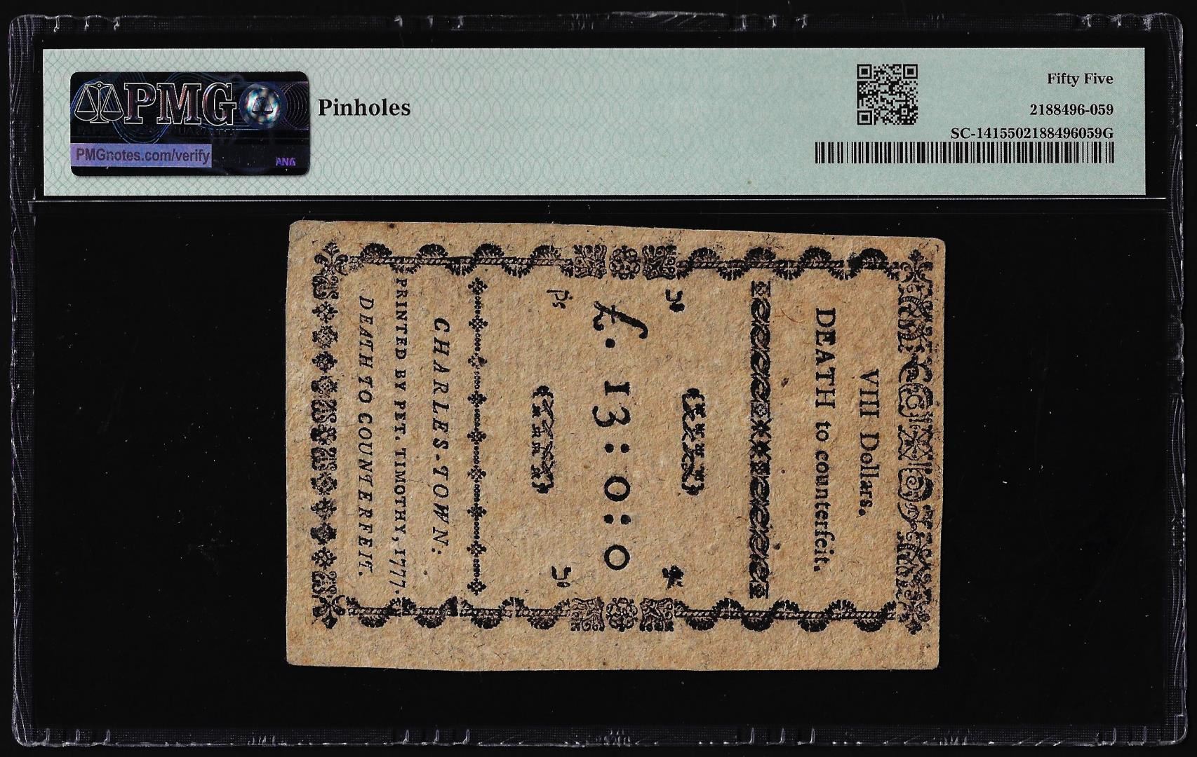 One December 23 1776 $8 South Carolina Colonial Note Fr. SC-141 PMG About Uncirculated 55. PMG Certified.