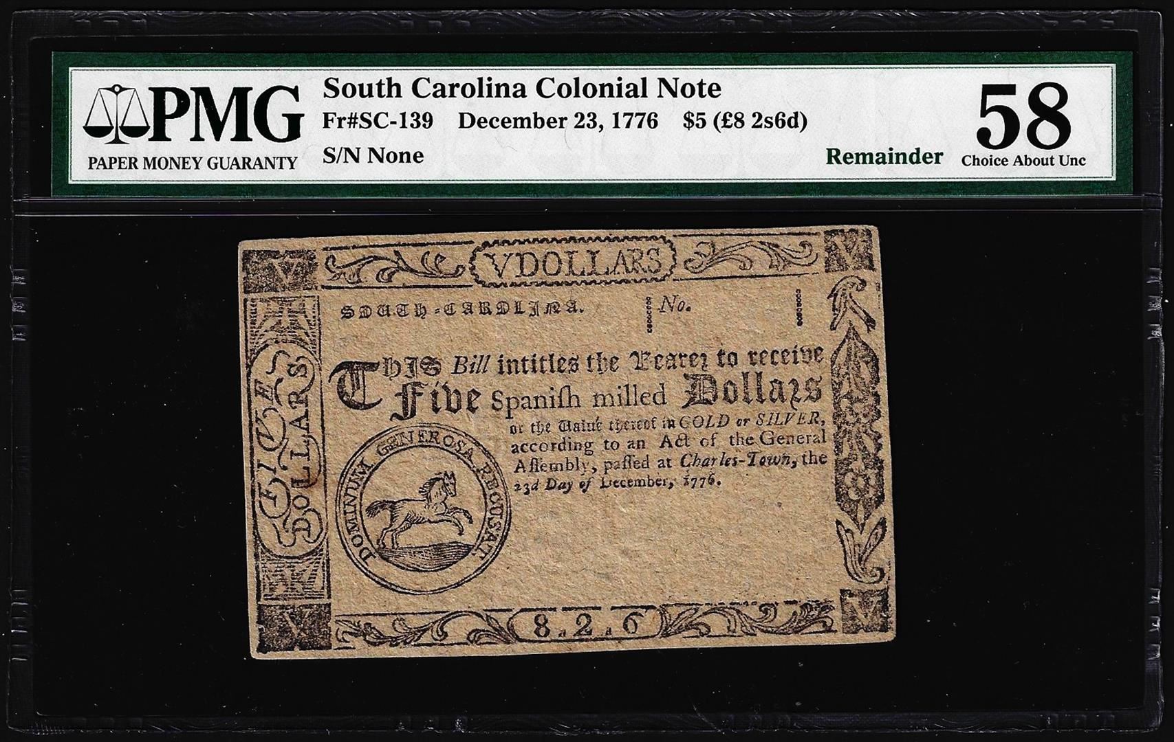 One December 23, 1776 South Carolina $5 Colonial Currency Note PMG Choice About Unc. 58. PMG Certified.