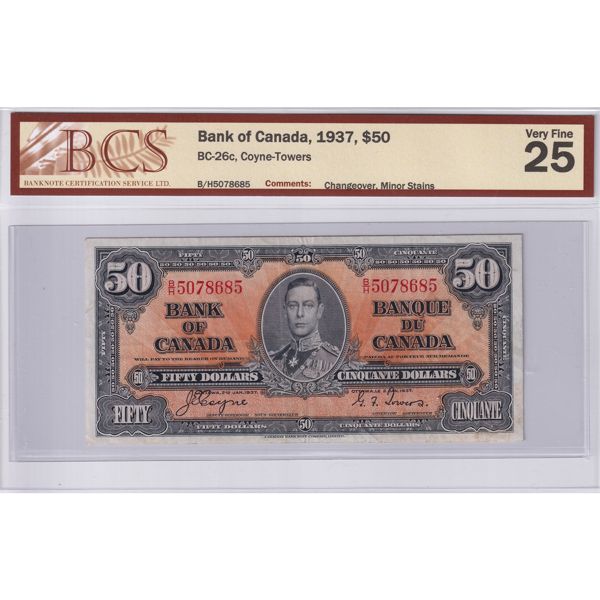 BC-26c 1937 $50 BCS VF25 Coyne-Towers SN: B/H5078685