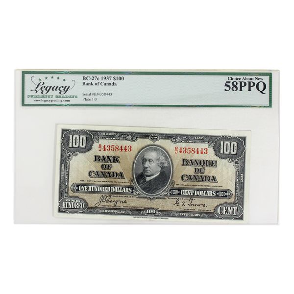 BC-27c 1937 $100 Legacy AU58 PPQ Coyne-Towers SN: B/J4358443