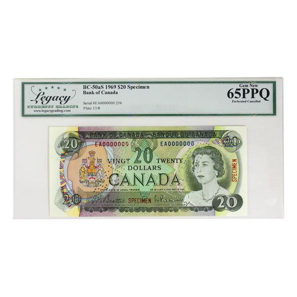 BC-50aS 1969 $20 "Specimen" Legacy GEM UNC65 PPQ Beattie-Rasminsky SN: EA0000000 #256