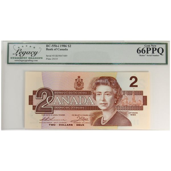 RADAR BC-55b-i 1986 $2 EGK9847489 Legacy GEM UNC66 PPQ Thiessen-Crow. 4-Digit Radar