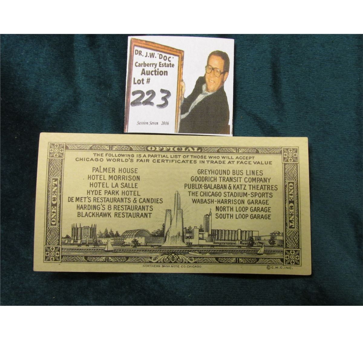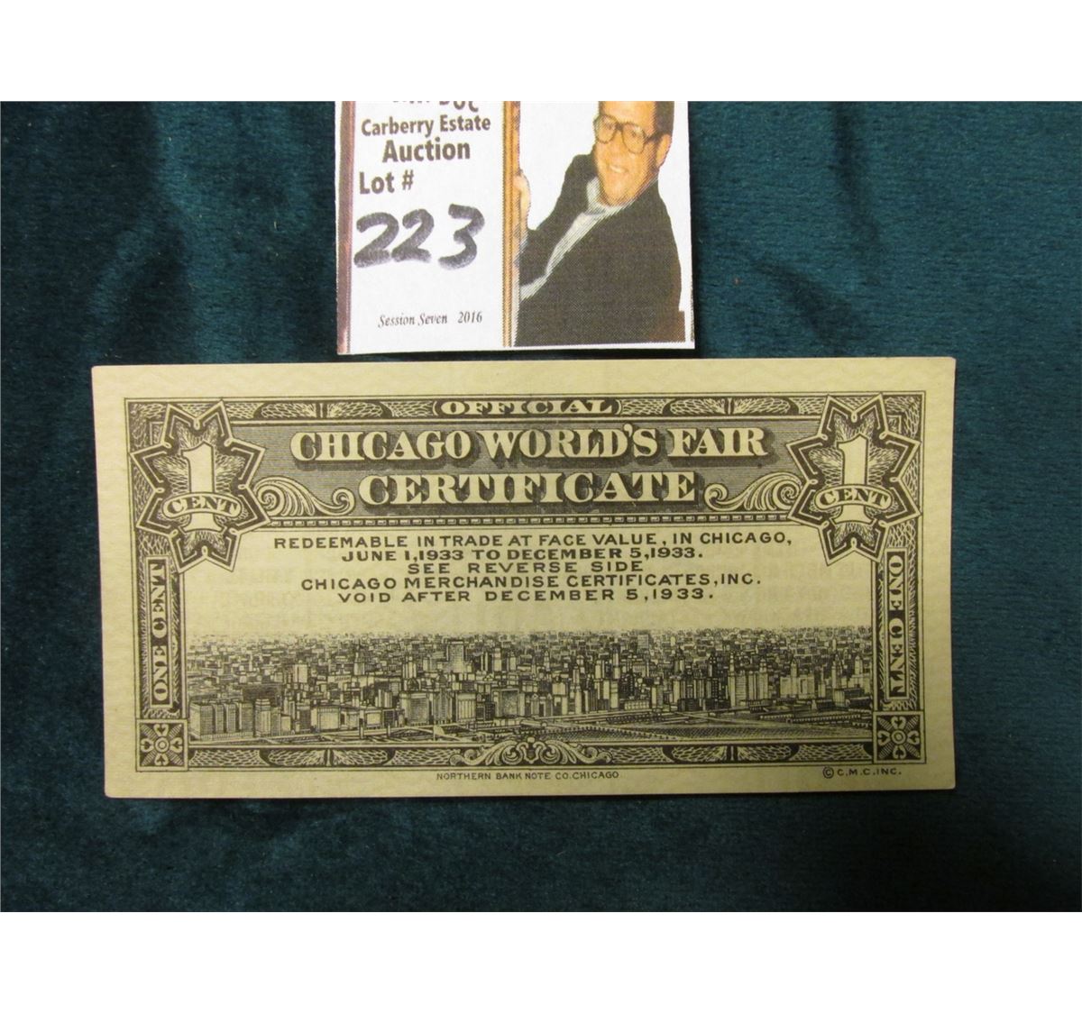 December 5, 1933 "Official World's Fair Certificate Redeemable in Trade at Face Value, in Chicago, J