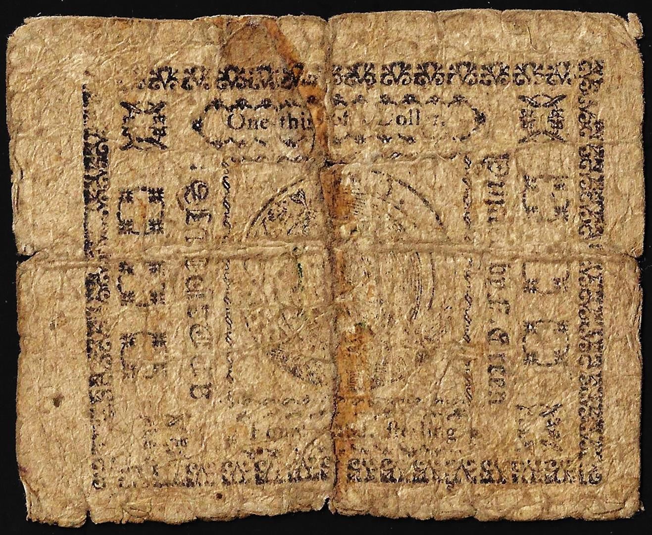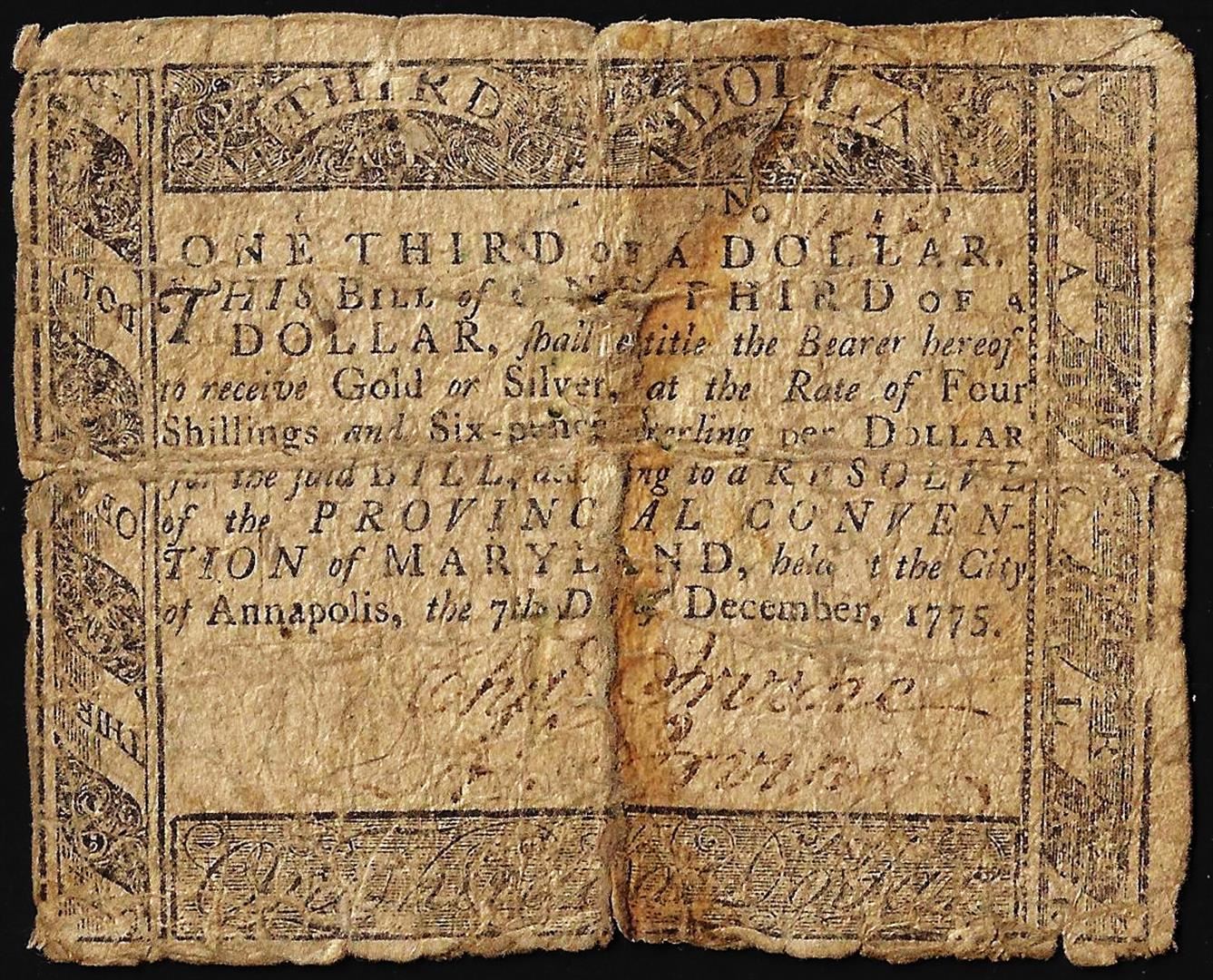 One December 7, 1775 $1/3 Maryland Colonial Currency Note .