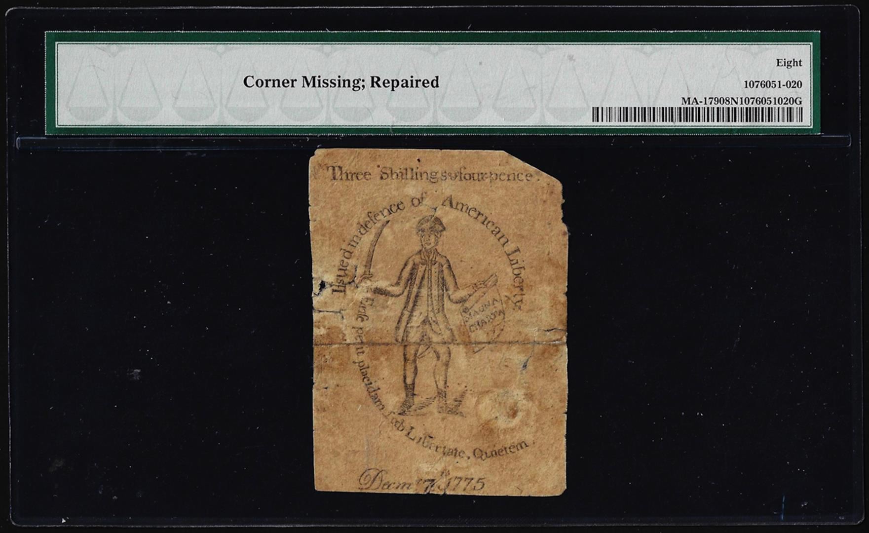 One December 7, 1775 Massachusetts 3 Shillings 4 Pence Colonial Note PMG Very Good 8 Net. PMG Certified.