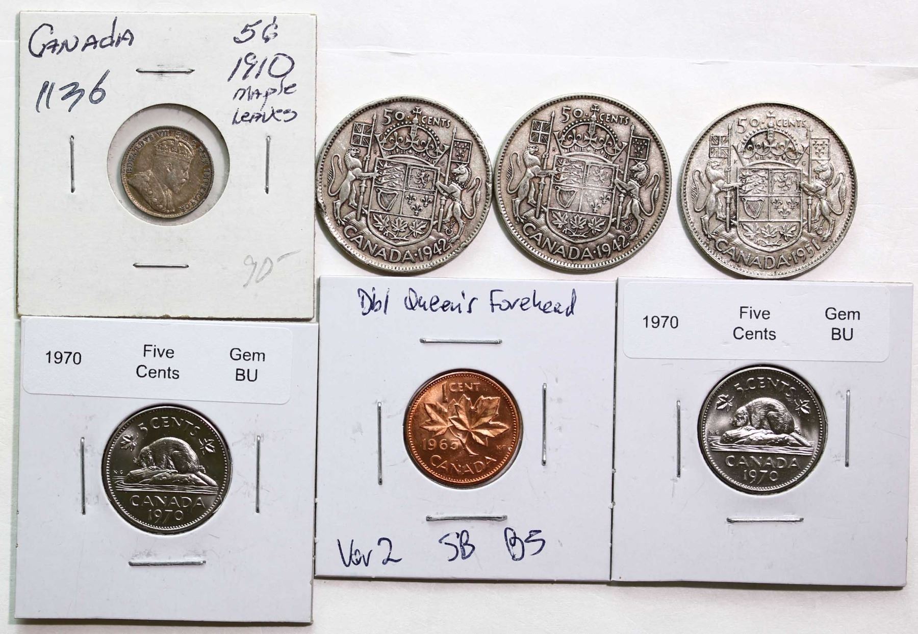 Decimal Lot; 1965 1¢ "Dbl Queen's Forehead", 1910 5¢ "Ptd Lvs", 1970 (2), 1942 50¢ (2), 1951. VG to