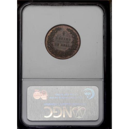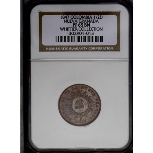 <B>Decimal Reform - Nueva Granada 1/2 Decimo 1847, </B></I>KM101, Proof 65 NGC Brown, highly attractive deep red and purple luster combined with silky, mirror surfaces - a most appealing copper coin.