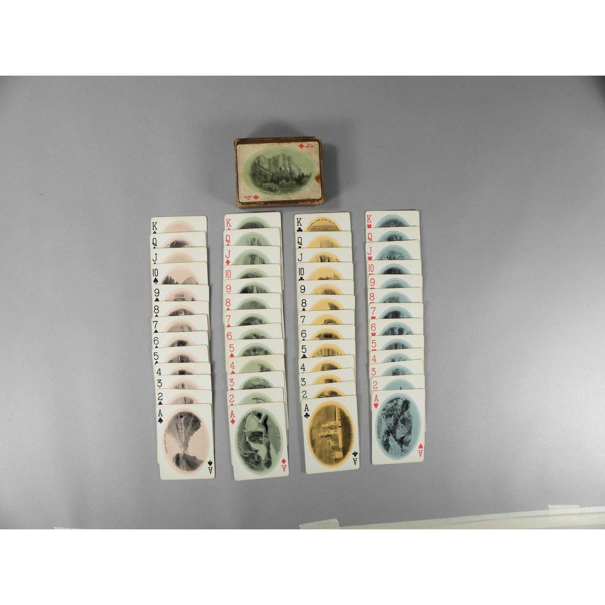 Deck of Playing Cards for Southern Pacific Lines RR, in original box. Depicting points of interest along the line. Gold edges. Missing joker otherwise complete. Cards in excellent condition, box in used condition. 3 X 3 1/2 inches.