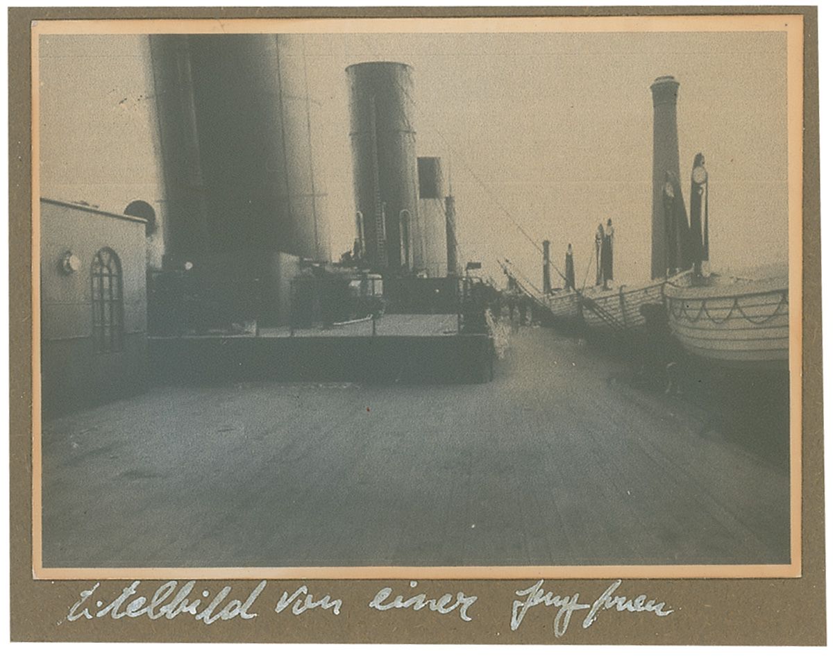 Original matte-finish 3.5 x 2.5 photo of Titanic’s deck with lifeboats visible on the right, affixed to a slightly larger sheet and captioned in German. In fine condition, with light scattered toning. Removed from an original scrapbook containing other period Titanic photographs.