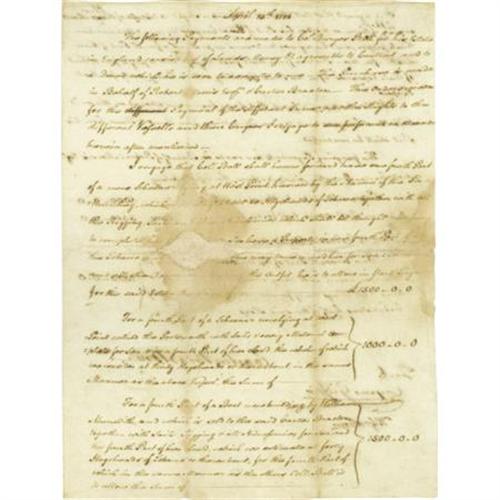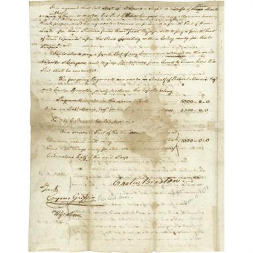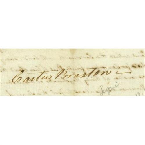 <B>Declaration of Independence Signer Carter Braxton DS,</B></I> one page with verso endorsement “<I>C. Braxton</B></I>”, 7.25” x 9.75”, n.p., April 13, 1778. Braxton, one of Virginia's representatives in the Continental Congress, was heavily engaged in financing the Patriot cause and lost his fortune in the process. This document details business arrangements with a Captain Ball. Heavily stained with archival repairs. Good condition. <I>Ex. Henry E. Luhrs Collection. </B></I> <BR><BR><b>Shipping:</b> Flat Material, Small (<a target="_blank" href="http://www.heritageauctions.com/common/shipping.php">view shipping information</a>)