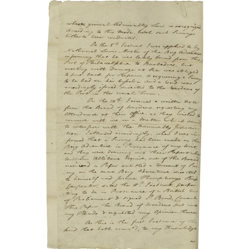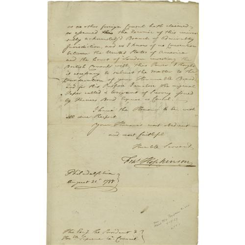 <B>Declaration Signer Francis Hopkinson Autograph Letter Signed</B></I> "<I>Fra. Hopkinson</B></I>". Three pages plus docketing information, 8" x 13", Philadelphia, August 21, 1788, to the President and Supreme Executive Council of Pennsylvania. An interesting letter written while a Judge of the Admiralty and regarding a warrant of survey on the brig <I>Adventure</B></I> directed to the Board of Wardens by a British Counsul. He writes "<I>...as I know of no Convention between the United States of America and the Court of London investing the British Consul with this Power, I thought it necessary to submit the matter to the Consideration of your Honourable Board...</B></I>" Hopkinson signed the Declaration of Independence as a representative of New Jersey. Very good condition, weakness at folds, and edge roughness archivally repaired. Originally purchased from Walter R. Benjamin Autographs. From the Henry E. Luhrs Collection. Accompanied by LOA from PSA/DNA.