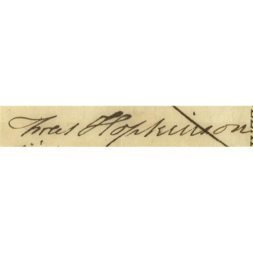 <B>Declaration Signer Francis Hopkinson Document Signed</B></I> "<I>Fras. Hopkinson.</B></I>" One page, 10" x 5", np, December 10, 1780. A Revolutionary War Bond for $1000, signed by the Treasurer of Loans Hopkinson and countersigned by Will Gibbes of South Carolina. Francis Hopkinson signed the Declaration of Independence representing New Jersey. The document is in fine condition; canceled with an "x" pen; very fragile paper, almost brittle; signatures are bold and crisp. From the Henry E. Luhrs Collection.