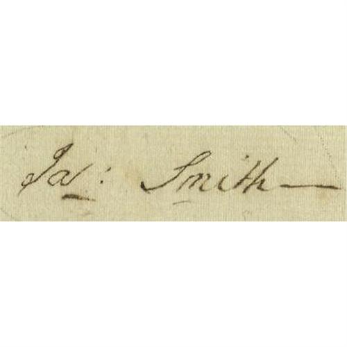 <B>Declaration Signer James Smith Document Signed Twice</B></I> "<I>Ja: Smith</B></I>". Two pages with docketing on verso of integral leaf, 11" x 16.5", York County, May 30, 1799. A long manuscript indenture involving Smith in a sale of land in Lewisburg to George Smith. James Smith has signed twice at the completion of the document. Smith signed the Declaration of Independence as a representative from Pennsylvania. This large document is in very good condition and has been linen-backed by a conservator to repair splitting at the folds. From the Henry E. Luhrs Collection. Accompanied by LOA from PSA/DNA.