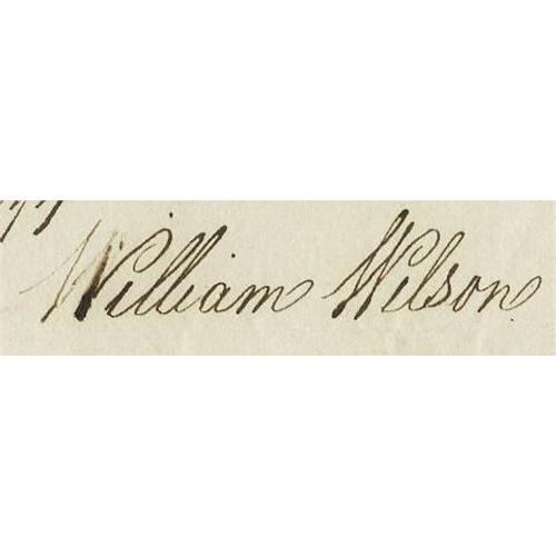 <B>Declaration Signer James Wilson Document Signed.</B></I> One page, 8.25" x 4.75", Philadelphia, June 16, 1794, to Samuel Meredith, Treasurer of the United States, requesting that his $875 salary be paid to William Wilson who has also signed this document. James Wilson signed the Declaration of Independence as a representative of Pennsylvania. He was also a member of the Constitutional Convention 1775-1777, 1783, and 1785-1786, a major force in the drafting of the Constitution, and one of the first six justices appointed to the Supreme Court by George Washington. Due to some dubious land speculation that caused him to be imprisoned twice, Wilson died penniless. Fine condition; folds. From the Henry E. Luhrs Collection. Accompanied by LOA from PSA/DNA.