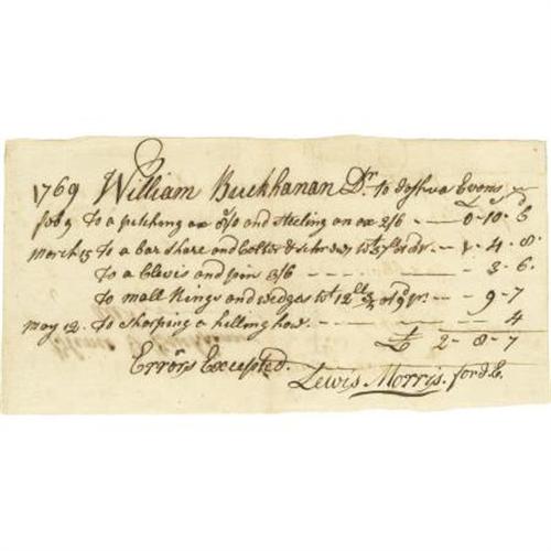 <B>Declaration of Independence Signer Lewis Morris DS,</B></I> one page with verso endorsement, 7.5” x 4”, n.p. (likely New York), May 12, 1769. Morris signs an invoice on behalf of a certain Joshua Evans. Light browning, fine condition. Lewis Morris represented New York in the Continental Congress. <I>Ex. Henry E. Luhrs Collection. </B></I><BR><BR><b>Shipping:</b> Flat Material, Small (<a target="_blank" href="http://www.heritageauctions.com/common/shipping.php">view shipping information</a>)