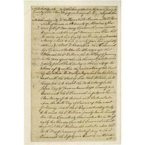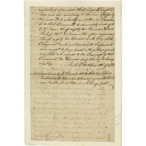 <B>Declaration Signer Richard Stockton Rare Autograph Document Signed.</B></I> Two pages, 7.5" x 12", Middlesex County, April Term, [1766]. A legal document by Stockton as attorney for the plaintiff, signed at the end as "<I>Rich Stockton</B></I>" and also in the body (third person) in full. Stockton signed the Declaration of Independence as a representative of New Jersey and was also a member of the Continental Congress in 1776. While on an inspection tour for the Congress, he was captured by the British and his poor treatment at their hands hastened his death which occurred in 1781 at age 50. Near Very Good condition, split at the middle fold, easily repaired. From the Henry E. Luhrs Collection. Accompanied by LOA from PSA/DNA.