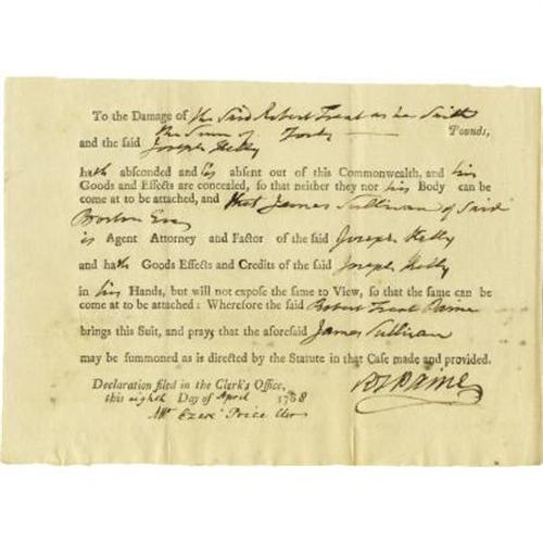 <B>Declaration Signer Robert Treat Paine Partially Printed Document Signed,</B></I> “<I>R T Paine,</B></I>”, one page, 7.5” x 5.5”, n.p. (likely Boston), April 8, 1788. Here Paine files a suit against a certain James Sullivan for a sum of forty pounds. In near fine condition with two vertical folds and even toning. Robert T. Paine (1731-1814) sat in the Continental Congress during the American Revolution and later became Attorney General for Massachusetts.<BR><BR><b>Shipping:</b> Flat Material, Small (<a target="_blank" href="http://www.heritageauctions.com/common/shipping.php">view shipping information</a>)