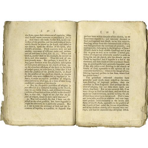 <B>Declaration Signer Roger Sherman Signed Book: <I>An Enquiry Concerning the Design and Importance</B></I></B></I> <I>of Christian Baptism and Discipline</B></I> by Nathan Williams, Pastor of the Church of Christ in Tolland (Hartford: Hudson and Goodwin, 1788), likely first edition, 86 pages, removed from bound volume, no wraps, 12mo (5.25" x 7.75"), Sherman's copy- signed by him "<I>Roger Sherman's</B></I>" on the title page at the upper right. A devout Congregationalist, Sherman once said to Congress in 1789 "It appears to me best that this article [the First Amendment] should be omitted entirely: Congress has no power to make any religious establishments, it is therefore unnecessary." Good condition, edges rough, tear on front (title) page. From the Henry E. Luhrs Collection. Accompanied by LOA from PSA/DNA.