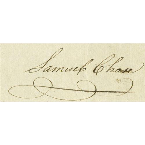 <B>Declaration Signer Samuel Chase Document Signed</B></I> "<I>Samuel Chase.</B></I>" Three pages, 7.75" x 7.6", Baltimore, Maryland August 14, 1793. This document is an oath of citizenship based upon Maryland's "An Act for Naturalization." Naturalization was a large issue in colonial America, before and after the Revolution. Samuel Chase signed this document as the Chief Judge in the state of Maryland. <BR><BR>The document is in very fine condition; edges slightly worn with small tears. From the Henry E. Luhrs Collection.