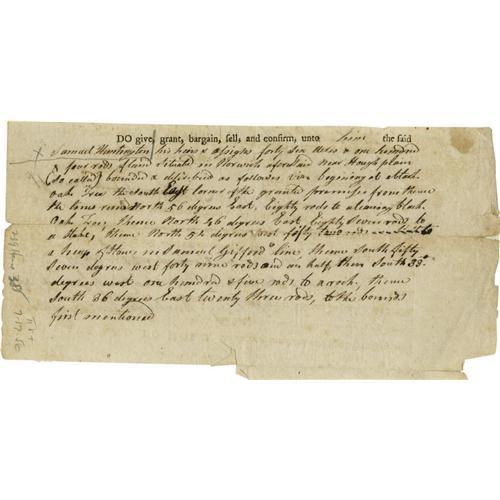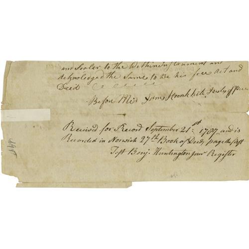 <B>Declaration Signer Samuel Huntington Autograph Document Signed</B></I> in the third person. One page, 8" x 4", Norwich, September 21, 1787. The lower portion of a partly printed document where Huntington is granted a tract of land in the state of Connecticut (of which he was governor) "<I>...forty six acres & one hundred & four rods of land Situated in Norwich aforesaid near Hough plain...</B></I>". Huntington was a fierce supporter of the Revolutionary cause, serving as a member of the Continental Congress and later as the first President of the United States in Congress Assembled. His writing on this lightly toned document is dark and legible; the folds are a bit weak with one old repair on the verso not affecting the docketing information, else very good. From the Henry E. Luhrs Collection.