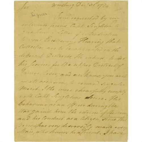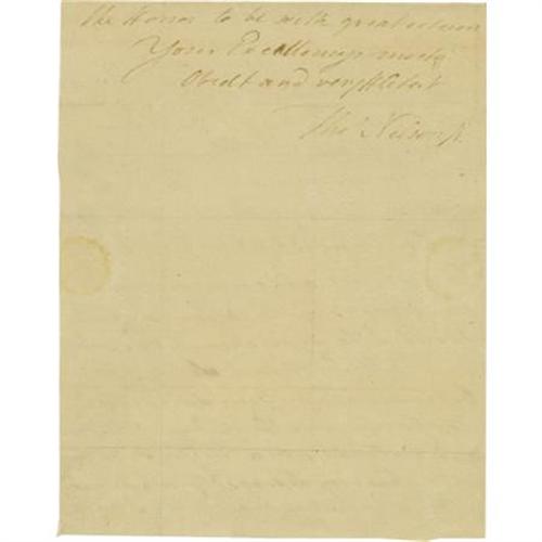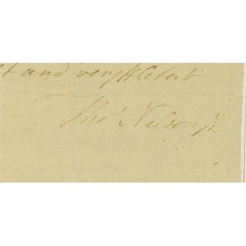 <B>Declaration of Independence Signer Thomas Nelson, Jr. Autograph Letter Signed,</B></I> “<I>Thos Nelson Jr</B></I>”, two pages, 6” x 8”, Williamsburg, Virginia, December 31, 1784, to unknown recipient. The letter reads, “<I>I am requested by my intimate friend Capt. Singleton to give him a letter of introduction to your Excellency. Hearing that collectors are appointed to different districts, he intends to offer his services for the upper District of James River' and as I know, you wish on all occasions, to reward singular merit, I the more cheerfully comply with Capt. Singletons desire. His behavior as an officer during the War gain'd him the esteem of the Army, and his conduct as a citizen, since that period has deservedly made every man, who knows him his friend. I have the honor to be with great esteem…</B></I>” Somewhat faded, although evenly toned and sound. Very good condition. Since Nelson is here seeking a political favor regarding a minor civil servant's position in Virginia, he is probably writing to Governor Patrick Henry. Thomas Nelson, Jr. had been an active patriot before and during the American Revolution. He sat in the Continental Congress, signed the Declaration of Independence and served as a general of Virginia Militia. <I>Ex. Henry E. Luhrs Collection. </B></I><BR><BR><b>Shipping:</b> Flat Material, Small (<a target="_blank" href="http://www.heritageauctions.com/common/shipping.php">view shipping information</a>)