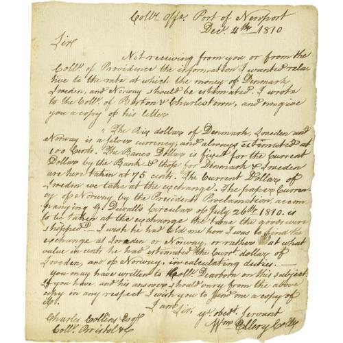 <B>Declaration Signer William Ellery Autograph Letter Signed</B></I> "<I>Wm. Ellery Collr.</B></I>" One page, 6.75" x 8", Collector's Office , Port of Newport, Rhode Island, December 4, 1810. The content of this letter regards exchange rates of foreign currency. It reads in part, "<I>…Not receiving from you or from the Collr. of Providence, the information I wanted relative to the rate at which the money of Denmark, Sweden, and Norway should be estimated, I wrote to the Collr. of Boston and Charlestown, and now give you a copy of his letter. The Big dollar of Denmark, Sweden and Norway is a silver currency and always estimated at 100 cents. The Banco dollar is fixed for the current Dollar by the Bank & those for Denmark & Sweden are here taken at 75 cents…</B></I>" William Ellery was a Declaration of Independence signer representing Rhode Island, he wrote this letter as customs collector of Rhode Island. This letter is a great look at how money was exchanged and traded at the turn of the 19th century. The letter is in very fine condition; usual folds are present; the edges are slightly rounded and worn. From the Henry E. Luhrs Collection.
