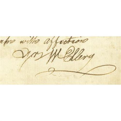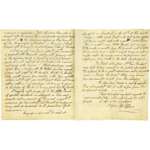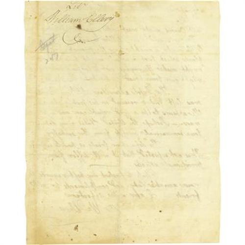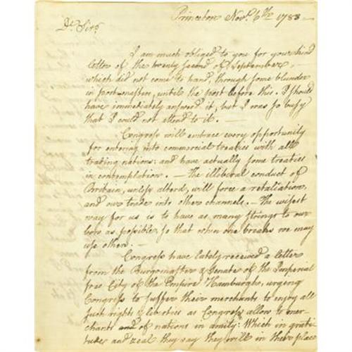<B>Declaration of Independence Signer William Ellery ALS,</B></I> “<I>W Ellery</B></I>”, three pages, 6.25” x 8”, Princeton, New Jersey, November 6, 1783, to an unknown recipient regarding free trade with European nations. In very small part: "<I>Congress will embrace every opportunity for entering into commercial treaties with all trading nations; and have actually some treaties in contemplation. -- the illiberal conduct of Britain, unless altered, will force a retaliation, and our trade into other channels. -- The wisest way for us is to have as many strings to our bow as possible... Congress have lately received a letter from the Burgomaster & Senate of the Imperial free city of the Empire Hamburgh, urging congress to suffer their merchants to enjoy all such rights & liberties as Congress allow to merchants of nations in amity... A treaty, as you have seen, is entered into with Sweden. One is proposed with Denmark, and another with Germany, and as the definitivetreaty is signed, as it is said & confidently believed, perhaps we shall enter into a commercial treaty with Russia... The Dutch Minister Mr. Van Berchal was last Friday received in his public character. He appears to be a good republican and a sensible man. -- Perhaps the United States may derive some commercial benefits from this embassy..." </B></I>Much more excellent content. This letter<I> </B></I> was penned while Ellery, representing Rhode Island, served on a Congressional committee governing maritime affairs. Evenly toned with bold ink, the letter has been tipped and presents in very fine condition. <I>Ex. Henry E. Luhrs Collection. </B></I><BR><BR><b>Shipping:</b> Flat Material, Small (<a target="_blank" href="http://www.heritageauctions.com/common/shipping.php">view shipping information</a>)