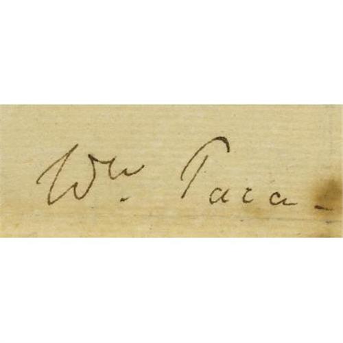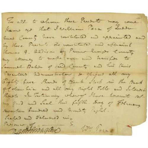 <B>Declaration of Independence Signer William Paca ADS,</B></I> “<I>Wm. Paca</B></I>”, one page with docketing, 8.25” x 7”, n.p. (likely Maryland), February 5, 1798. A file copy of a document bestowing power of attorney upon a Thomas G. Wilson of Prince Georges County. William Paca represented Maryland in the Continental Congress. Moderate soiling, one turned corner, uneven right margin. Good condition. <I>Ex. Henry E. Luhrs Collection. </B></I><BR><BR><b>Shipping:</b> Flat Material, Small (<a target="_blank" href="http://www.heritageauctions.com/common/shipping.php">view shipping information</a>)