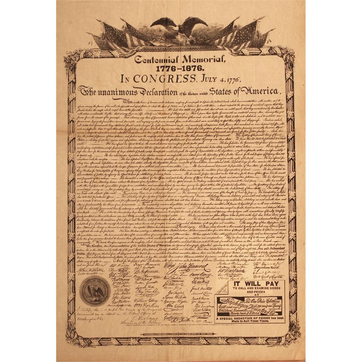 Declaration of Independence Centennial Memorial print, published by Columbian Publishing Co., New York in 1876. Patriotic border has an emblem of an eagle between furled American flags at top. Lower left has facsimile seal reading, ''I Certify This Is A Perfect Facsimile Of The Original Document Now On Deposit In The Patent Office At Washington D.C.'' Document, measuring 13.5'' x 19'' has an ad for a clothiers at lower right. Creasing and toning throughout, with a few small tears and chips at right margin edge. Very good plus condition.
