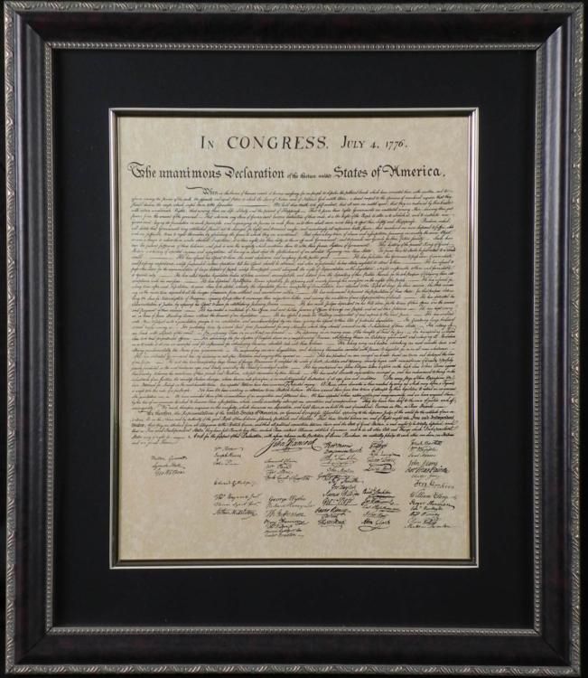 This is a brand new custom framed and matted replica of the Declaration Of Independence. It is beautifully framed in a modern contemporary style. Perfect for any office or study.The documents are printed in Antiqued parchment paper that looks and feels au