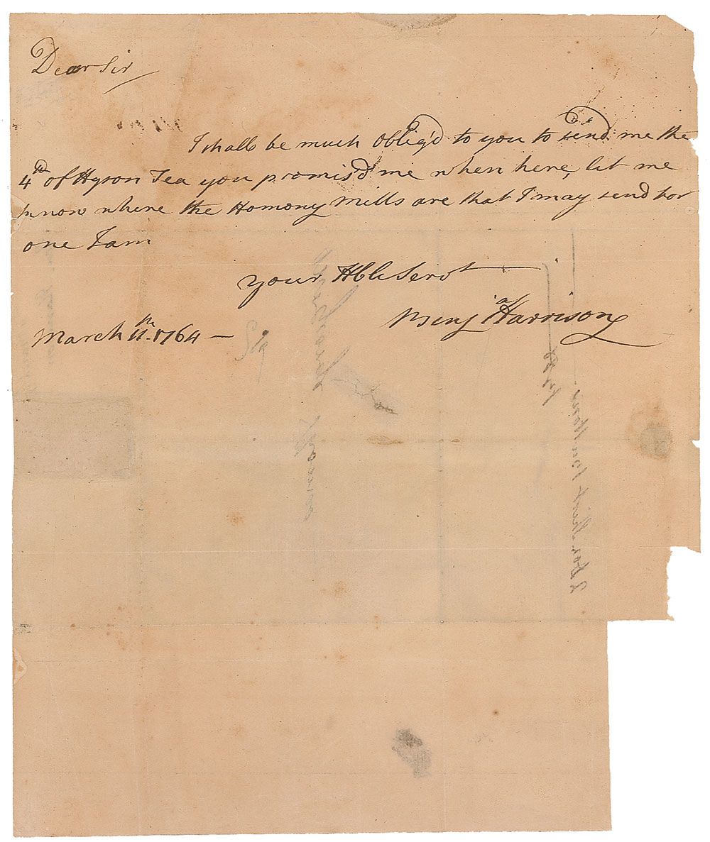 Signer of the Declaration of Independence from Virginia (1726 -1791). Harrison was the father of President William Henry Harrison and great-grandfather of President Benjamin Harrison. ALS signed “Benj Harrison,” one page, 7.5 x 9, March 11, 1764. Short letter to George Thomas. In full: “I shall be much obliged to you to send me the 4th of Hyson Tea you promised me when here, let me know where the Homony Mills are that I may send her one.” Rerverse bears an address panel in another hand, as well as a notation in Harrison’s hand which reads, “2 Doz Shirt Buttons—BH.” In very good condition, with intersecting folds, one through a single letter of signature, some show-through from writing on reverse, paper loss to lower right, and scattered toning.