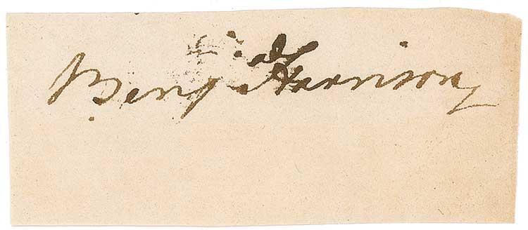 Signer of the Declaration of Independence from Virginia (1726 -1791). Harrison was the father of President William Henry Harrison and great-grandfather of President Benjamin Harrison. Ink signature, “Benj. Harrison,” on an off-white 2.5 x 1.25 slip. In fine condition, with a few stray ink marks and light toning. Pre-certified John Reznikoff/PSA/DNA and RRAuction COA.